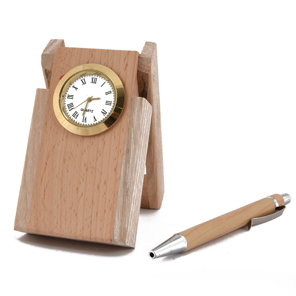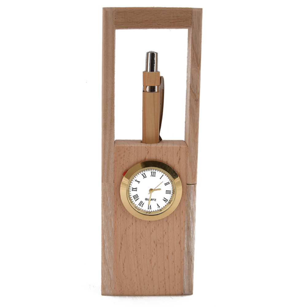 Personalized Logo Name Engrave Wooden Single Pen Stand with Clock